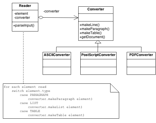 将用于解释(即读取和解析)存储的持久性机制(例如 RTF 文件)的算法与用于构建和表示许多目标产品(例如 ASCII、TeX、文本小部件)之一的算法分开。重点/区别在于创建复杂的聚合。
